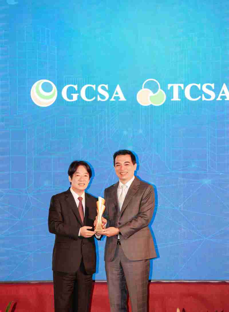 达全方位永续表现获全球永续奖及台湾永续奖肯定,,,,由副总统赖清德颁奖 (左),,william威廉中文官网总经理柯富仁 (右) 代表领奖