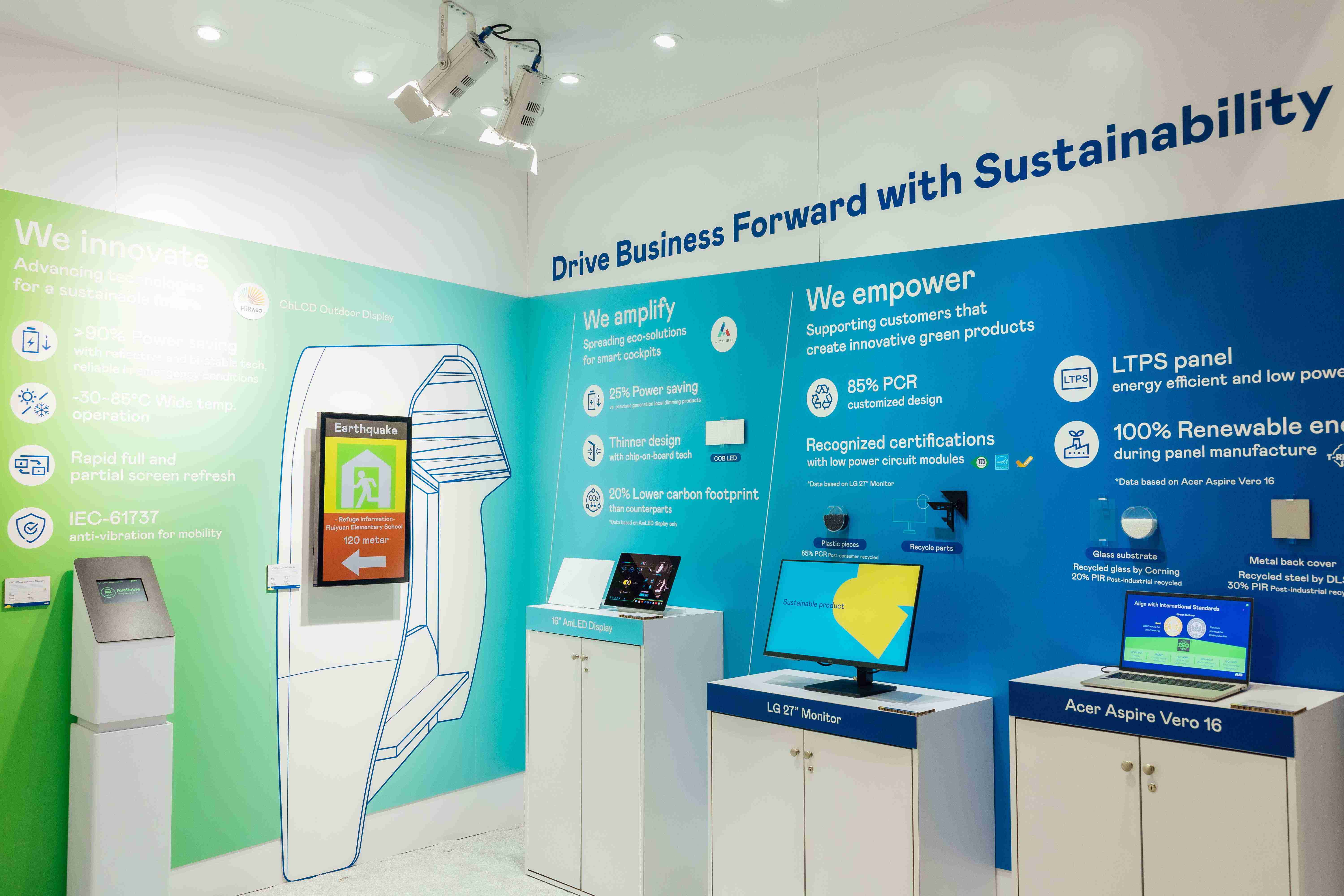 william威廉中文官网运用创新显示技术HiRaso胆固醇液晶双稳态技术达到显示零耗能、、、、扩大节能省电的AmLED显示技术应用于车用产品、、、、以再生的消费后回收(PCR)塑料及全绿电生产之面板,,,应用于笔电及萤幕,,,,增加绿色价值。。