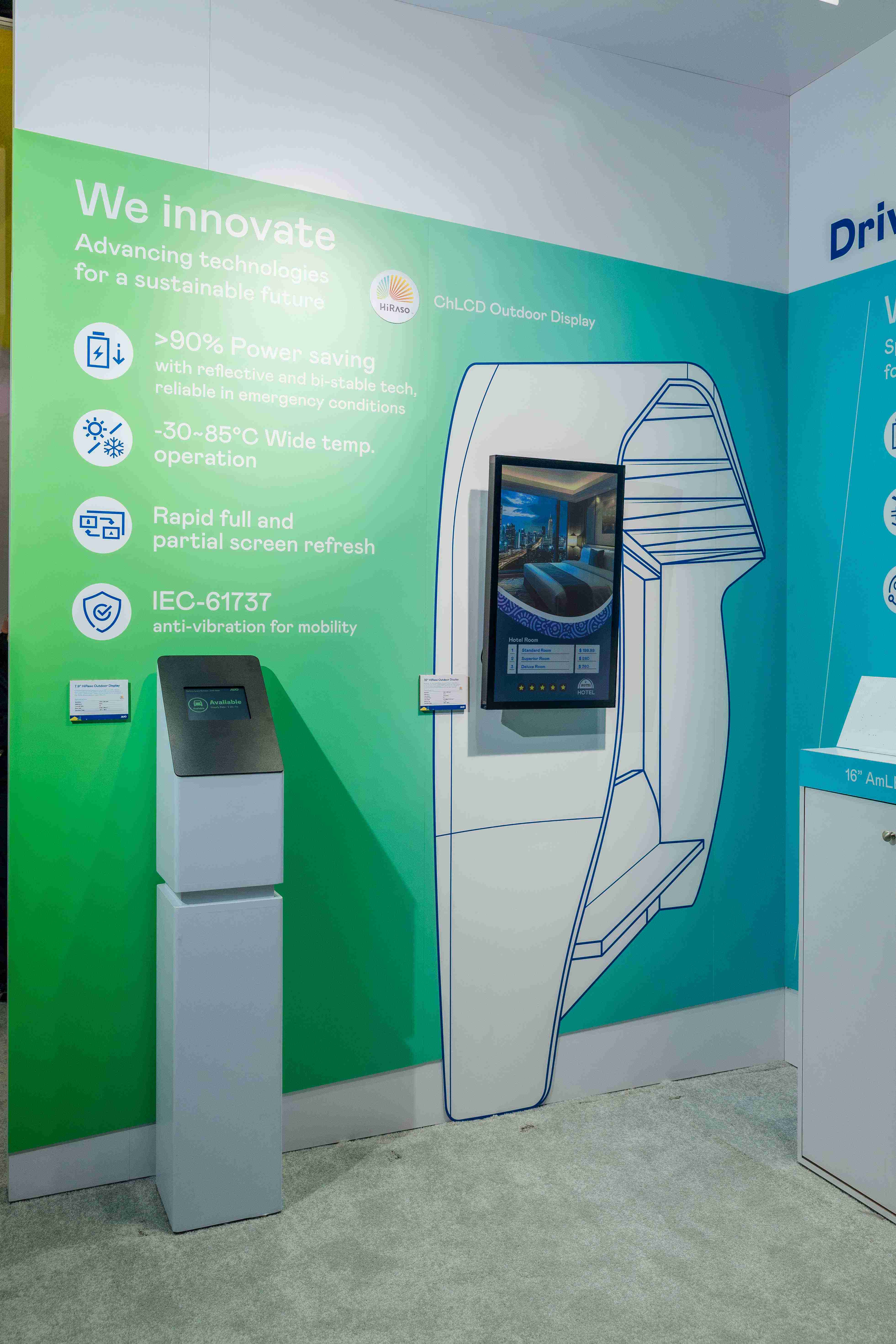 HiRaso胆固醇液晶显示器运用反射环境光线的方式,,,,呈现影像显示时零耗能的环保省电诉求,,光线愈强愈能呈现绝佳的色彩饱和度及显示效果,,,同时在摄氏-30度至85度间宽温的使用优势,,,,为户外电子看板的新首选。。。。