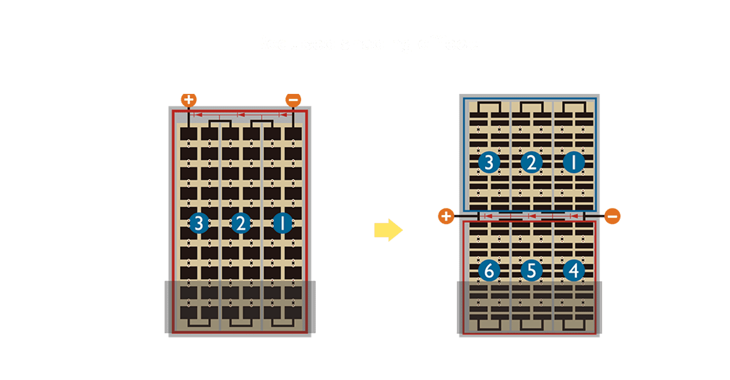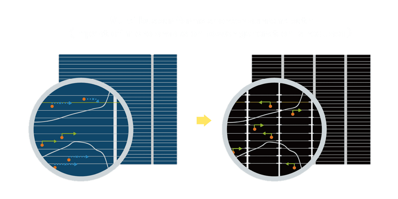 • 电池使用多条铜导线 (Copper wire) 于电池片上形成较短的电流路径,,提高电流收集效率,,,采用圆形设计的铜导线较传统扁平式的铜焊带 (Ribbon),,,可增加入射至电池的光线量。。。。